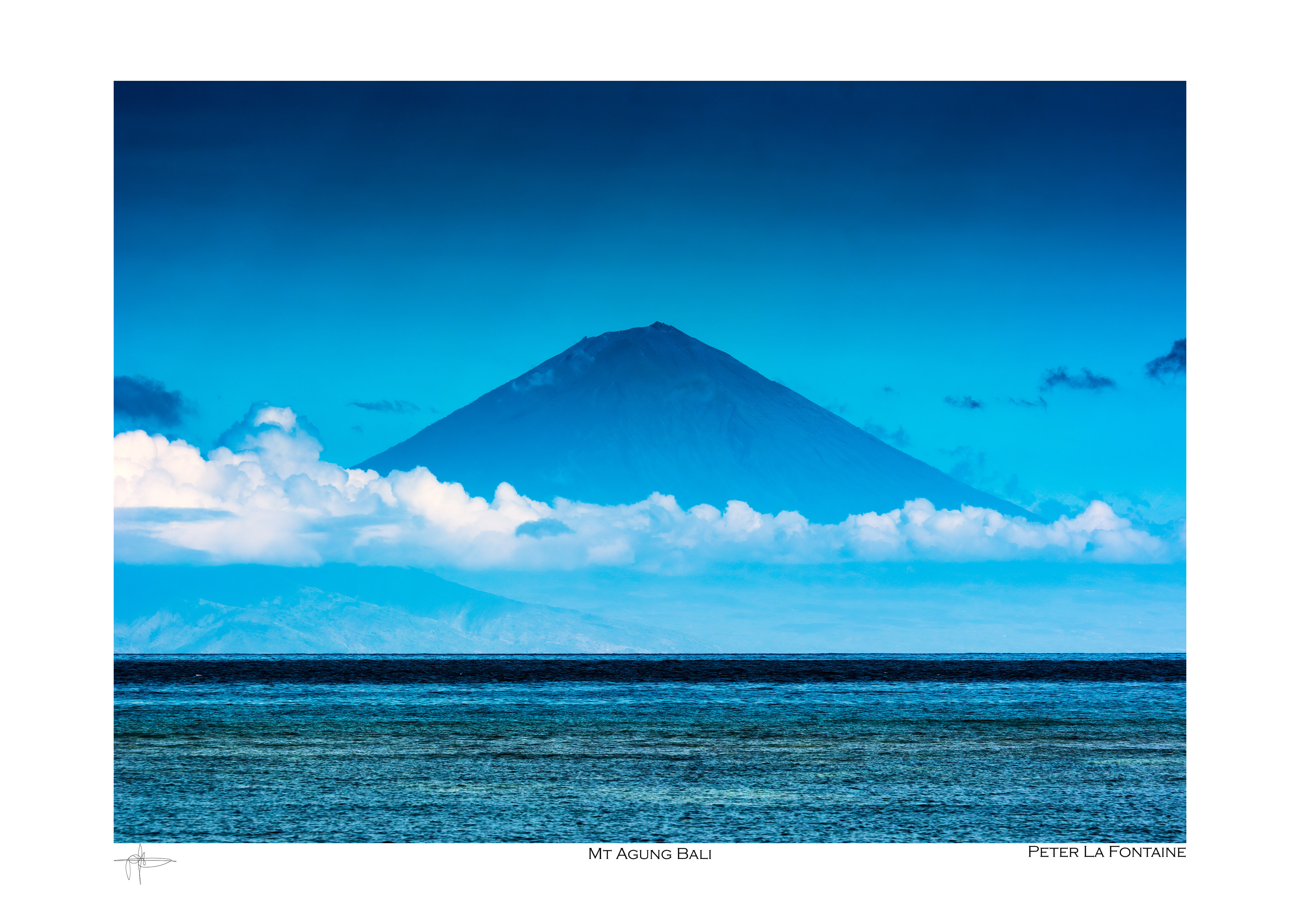 mt agung is bali's most well known volcano. often she can be very temperamental and often erupts causing havoc to locals and tourists alike. this image was taken from the 'sunset' side of gili trawangan and is a very rare photo as typically she is cloaked in cloud. if you look hard you can actually see the foot hills of bali mainland sloping ino the lombok strait.