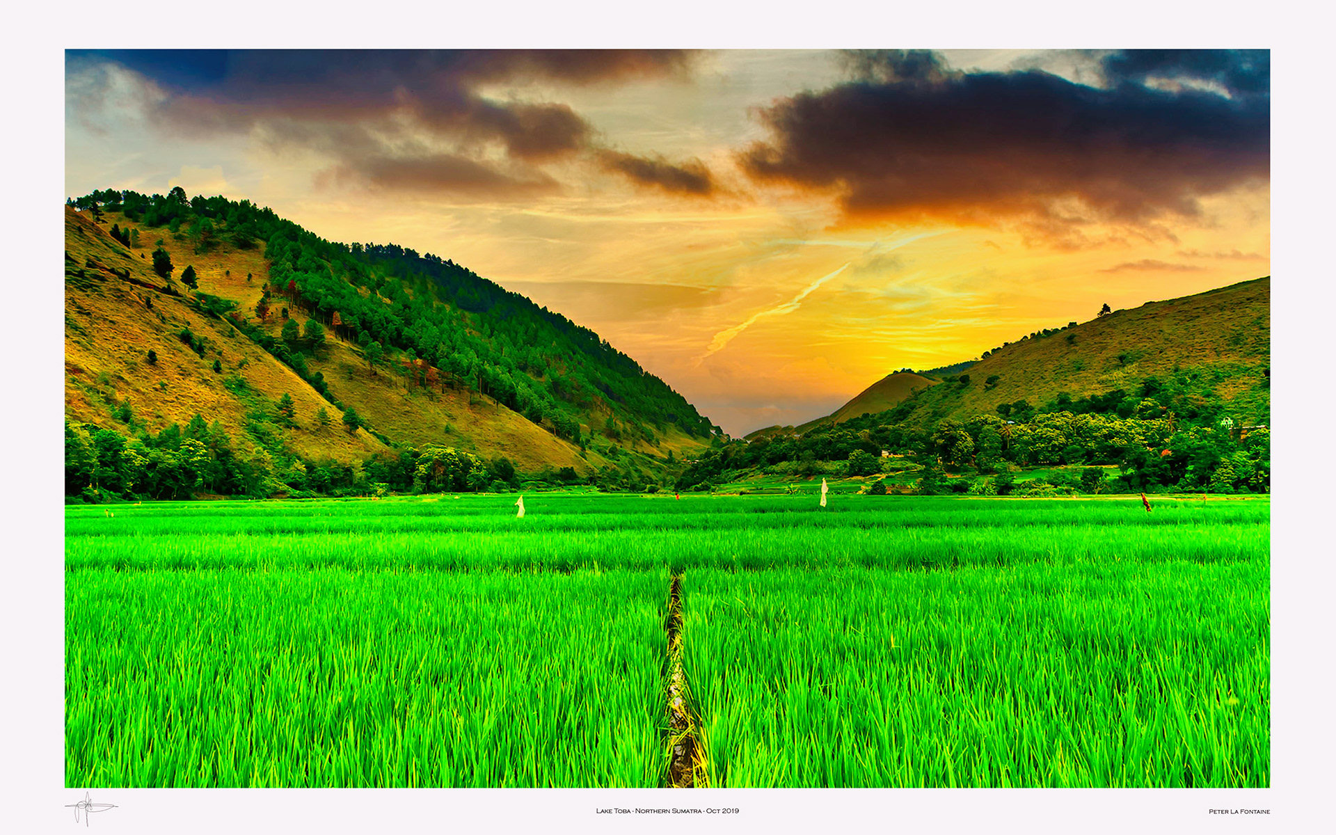 this photo was taken on my trip to sumatra indonesia. what a place! there is so much natural beauty and just warmth in the people that i can't wait to get back there again. this photo is of rice fields that surround lake toba which is a huge lage in the middle of sumatra. the land is extremely fertile being volcanic the people more than happy for us to be there taking pics.