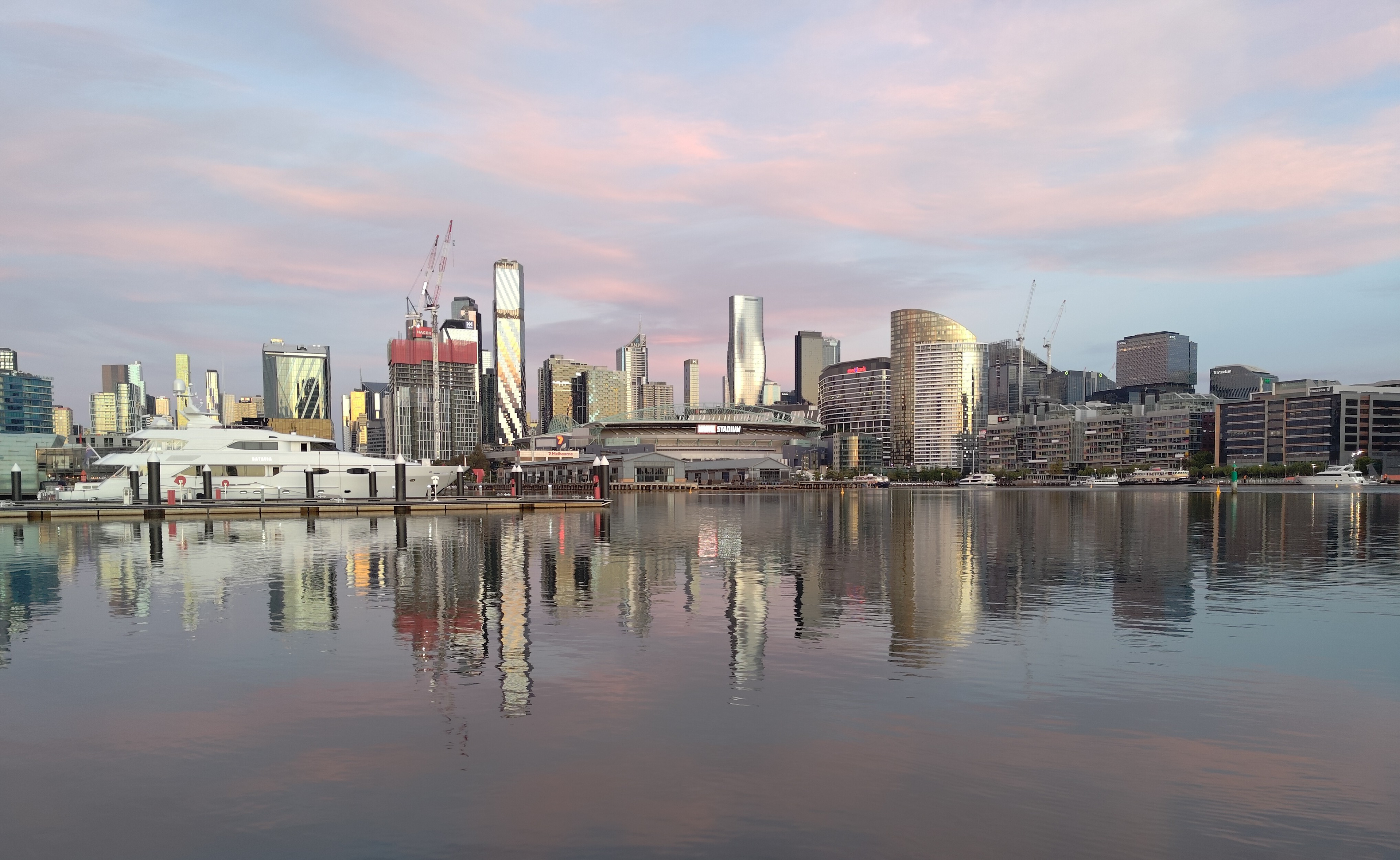 This photograph captures the Docklands precinct in Melbourne, Australia, viewed across the Yarra River at sunset.