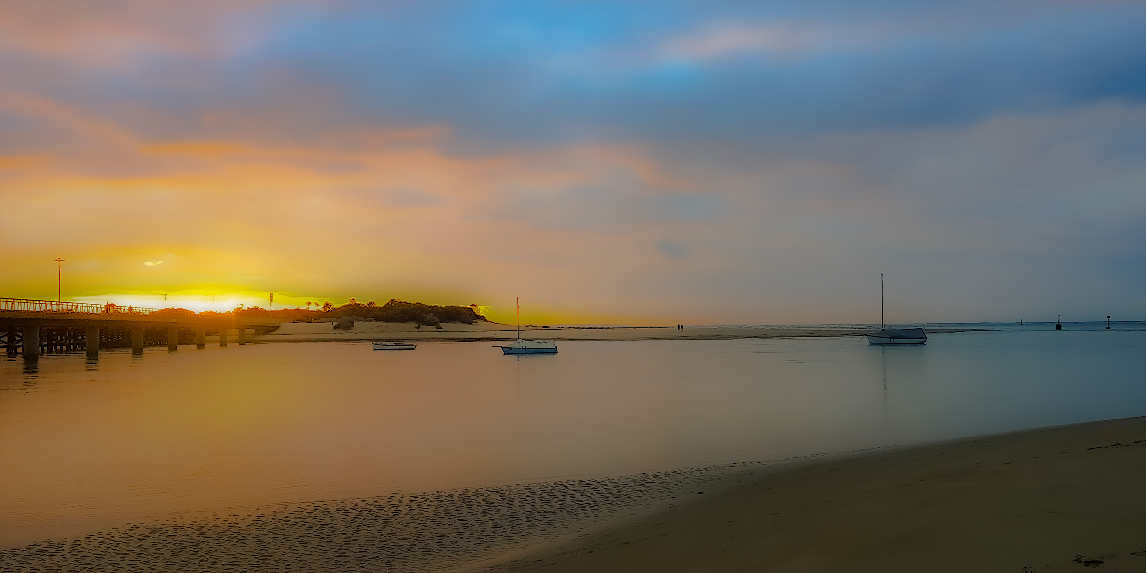 Barwon heads was muy home for 15 years and is simply one of the most beautiful Seaside villages within victoria. While the bridge has been the discussion of numerous political conversations it the little mouth of the river is home to a few older "couta" style boats. this image was captured early one morning and i just love the colors and the smoothness of the water. if you look really closely you can see the couple walking together on the other side of the river.