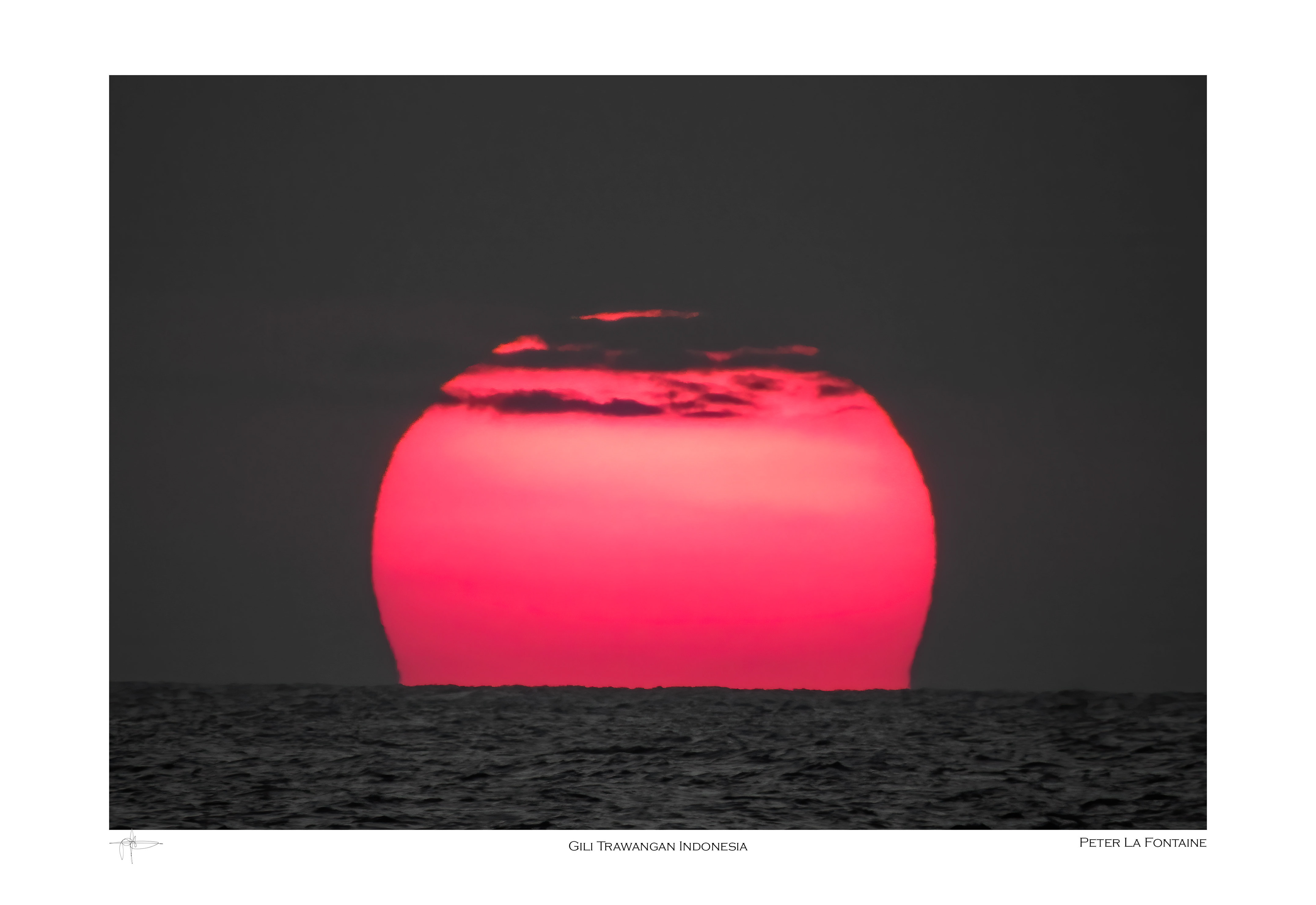 Gili trawangan is simply one of my favourite places in the world. the feeling of the island is something to experience and while it offers everything a small island should its its sunsets that top the list. the 'sunset' side of the island is a must at approximately 5.30pm everyday. grab a beer and sit on beach and watch one of this earth's most amazing views which is the sun setting to the west. this photo was taken with a camera that has a massive focal length and so you can make out the rough edges of the sun itself.